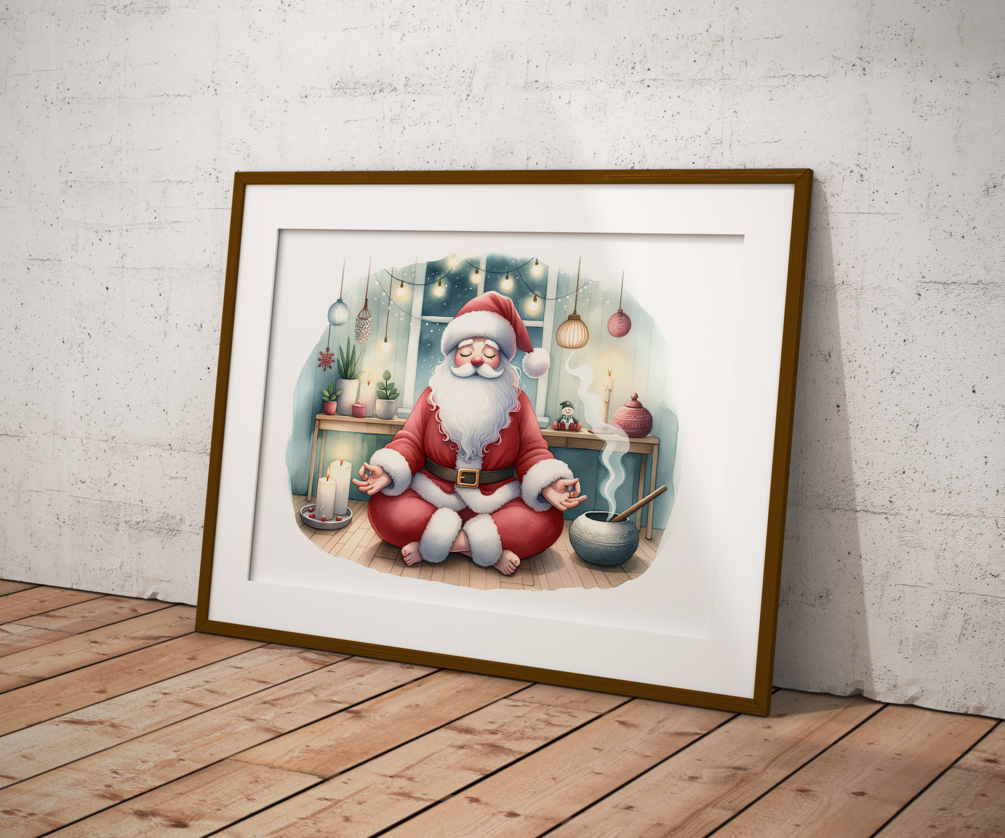 Join Santa in a moment of serene repose with the 'Santa's Retreat' poster! Tucked away from the North Pole hustle, Santa embodies the calm of the season, seated in a meditative pose. Surrounded by soft candlelight, charming succulents, and the gentle glow of festive lights, this poster is a heartwarming reminder to savor peaceful moments during the holiday whirlwind. Perfect for adding a touch of tranquil joy to any room, it's an ideal gift for those who love the lighter side of Santa's story. Let your Christmas be merry and mindfully bright with this delightful display!