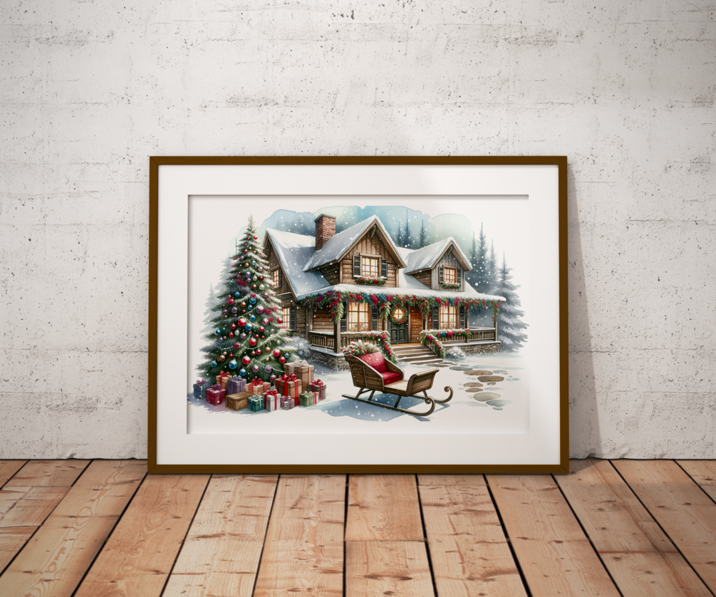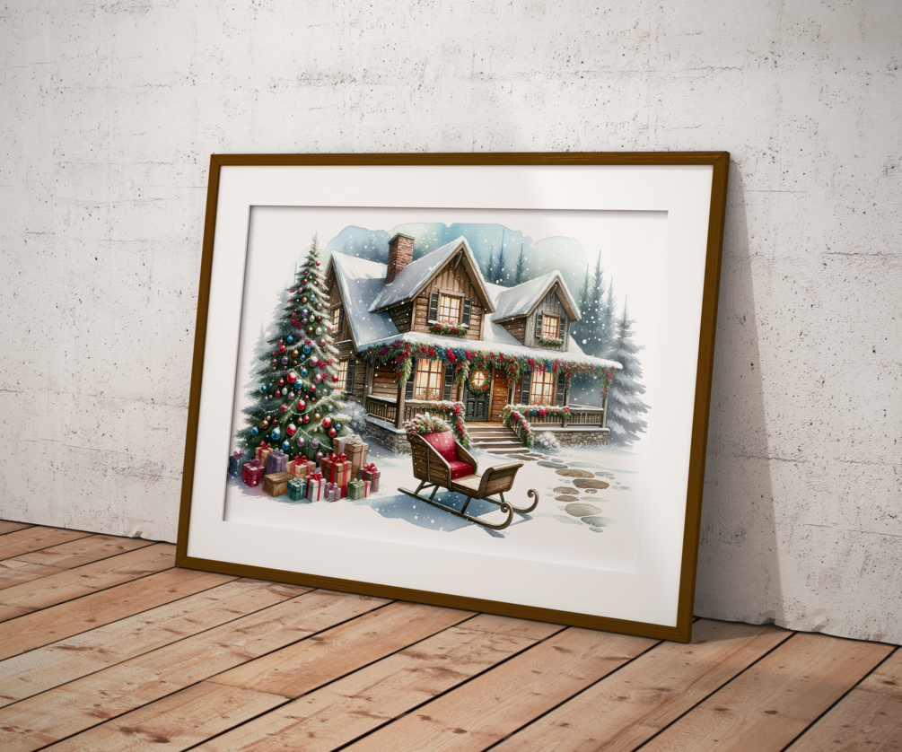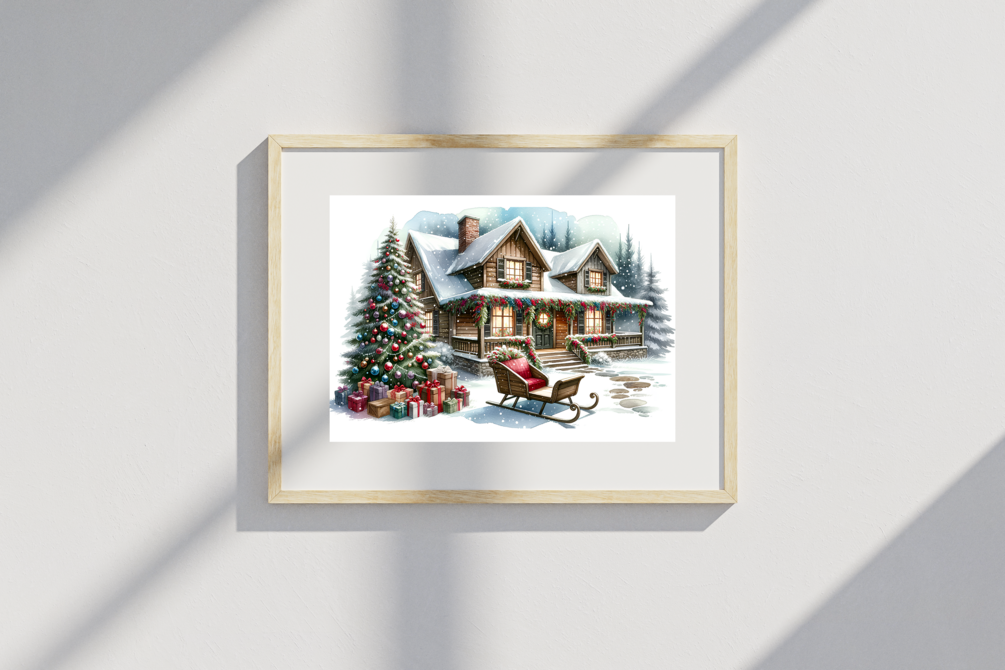Step into a snowy scene of holiday delight with the 'Home for the Holidays' poster! This enchanting winter cabin, decked out in festive finery, is a dreamy destination for Santa's sleigh. With a beautifully adorned Christmas tree standing guard over a bounty of gifts, and a cozy sleigh bench waiting for its next passenger, this picture-perfect setting captures the essence of Christmas warmth. The twinkling lights and fresh snowfall invite you to curl up and watch the snowflakes dance. It's the perfect addition to bring home that snug holiday feeling, or to gift a little piece of winter wonderland magic!
