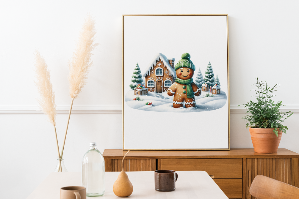 Who says gingerbread men can't have a taste of the great outdoors? This spirited gingerbread fellow has escaped the oven's warm embrace and embarked on a winter wonderland adventure. With a twinkle in his gingery eyes and a curious smile, he stands proudly in front of his gingerbread house, admiring the snow-covered trees and frosty rooftops. The world is his oyster, and he's ready to explore every snowy nook and cranny. This delightful illustration captures the essence of holiday cheer and the childlike wonder of winter exploration. It's the perfect addition to any home or workspace, bringing a touch of warmth and whimsy to the season. Whether you're wrapping up warm by the fireplace or enjoying a cozy cup of cocoa, this cheerful gingerbread man will set your spirit ablaze.